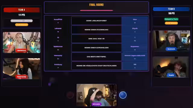 01:49:02Nach der letzten Frage endet die Einzelphase des Quiz mit einem klaren Sieg für das Team aus Noah und Revi, gefolgt von Rose und abgeschlagener Platz für Felix. Der Streamer tröstet den sichtlich frustrierten Felix und erklärt humorvoll den Begriff des Dispos. Danach startet ein komplett neues, teambasiertes Format, bei dem Nova gegen alle anderen antritt. Nach technischen Anlaufschwierigkeiten beginnt ein Ratespiel, bei dem die Teilnehmer die häufigsten Antworten von Zuschauern erraten müssen.
