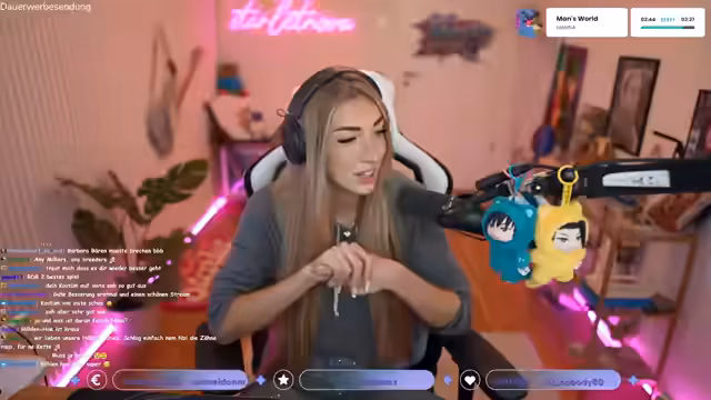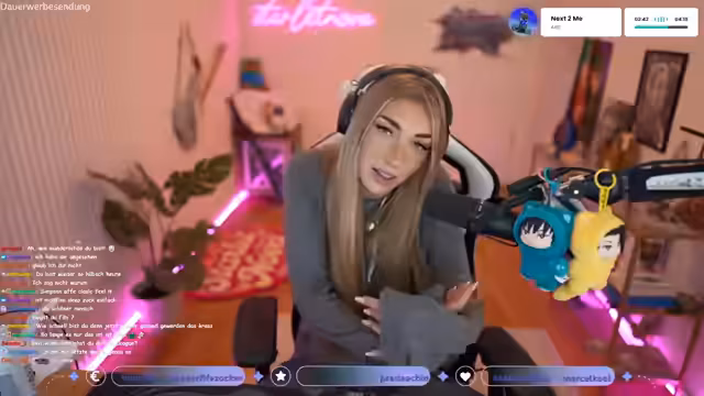 03:05:15Der Streamer spricht über ihre Entscheidung, ihre Haare wieder in ihrer Naturhaarfarbe zu tragen, nachdem sie fast zehn Jahre lang blondiert war. Sie zeigt sich sehr zufrieden mit dem natürlichen Look, den sie als 'bisschen more natural' beschreibt, und findet, dass Haar- und Augenfarbe gut zusammenpassen. Sie erwähnt, dass dies ein bewusster Schritt ist, da sie sich nicht mehr so oft färben möchte und das Auswachsen der Haare für sie in Ordnung ist. Eine Zuseherin beobachtet, dass ihre Haarfarbe warm und natürlich wirkt.