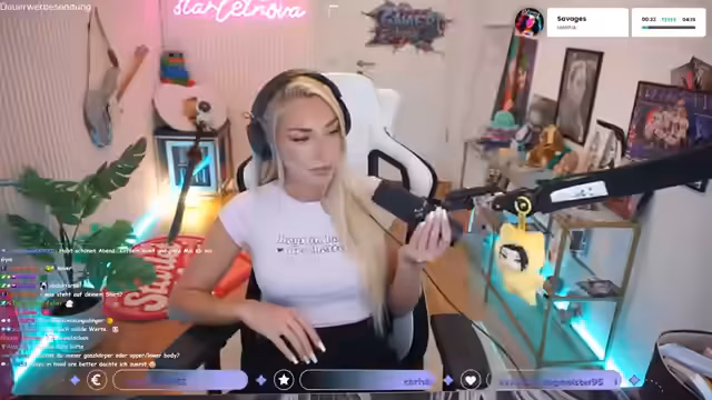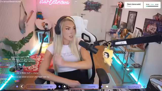 01:29:20Die Streamerin berichtet, dass sie aufgrund ihrer Plastiknägel momentan keine E-Gitarre spielen kann, was sie bedauert. Sie unterhält sich über ihren Musikgeschmack und äussert sich kritisch zu Fortnite, trotz des K-Pop-Demonhunter-Skins. Ausserdem erwähnt sie eine Fleck auf ihrem Shirt und denkt darüber nach, dies von der Steuer absetzen zu können. Diese persönlichen Anekdoten zeigen ihre lockere und selbstironische Art.