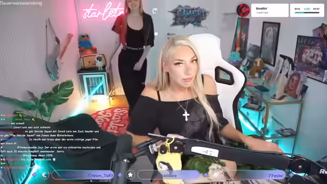 02:03:10Die Streamerin diskutiert über mögliche Valorant-Cosplay-Outfits und kommt zu dem Schluss, dass Viper die einzige Figur sei, die sie sich vorstellen könnte. Sie erwähnt auch die Idee, Haarfarben zu wechseln, und überlegt, ihre Haare wieder grün zu färben, nachdem eine Lieferung nicht rechtzeitig angekommen war. Eine mögliche Zusammenarbeit mit einem anderen Streamer für Cosplay-Themen wird ins Auge gefasst. Sie bevorzugt lange Haare und Charaktere mit attraktivem Aussehen, was die Diskussion um geeignete Outfits weiter befeuert.
