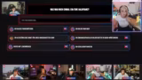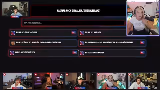 00:34:34Der Stream wechselt zur Gameshow. Die Teilnehmer melden sich mit ihrer Kamera an, nachdem der Streamerin technisch geholfen wurde. Das Spielprinzip wird erklärt: Jeder gibt eine Antwort auf eine knifflige Frage, um die anderen zu täuschen, und Punkte werden für das Erraten der richtigen Antwort oder das Täuschen anderer vergeben. Die erste Frage, die ein Gesetz in Kalifornien betrifft, führt zu humorvollen und kreativen Antworten, wobei die Streamerin Schwierigkeiten beim Lügen hat.