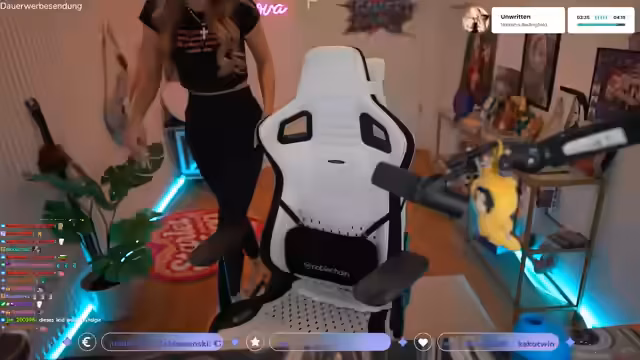 03:27:32Während des Spiels interagiert die Streamerin intensiv mit dem Chat. Sie ist offen für Backseat-Gaming und präsentiert sich selbstbewusst als Gamerin. Sie kommt in Kontakt mit anderen Spielern, kooperiert mit ihnen und entwickelt eine dynamische Spielstrategie. Dabei erlebt sie sowohl freundliche als auch feindliche Begegnungen in der Spielwelt, was die emotionalen Höhen und Tiefen des Livestreams zeigt.