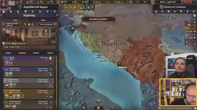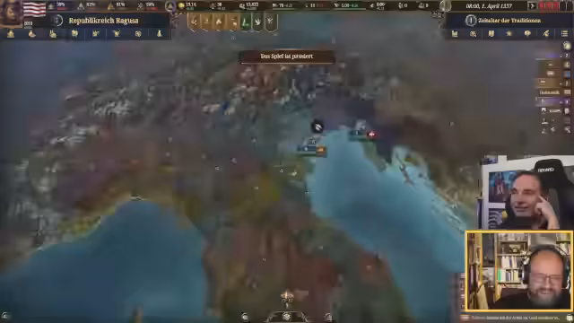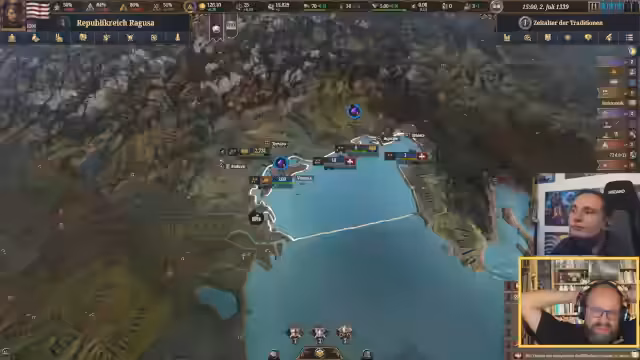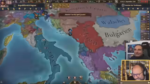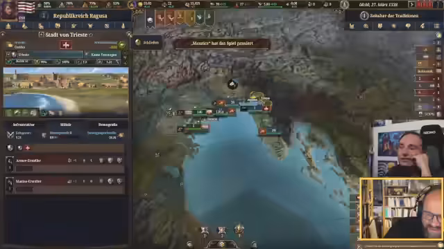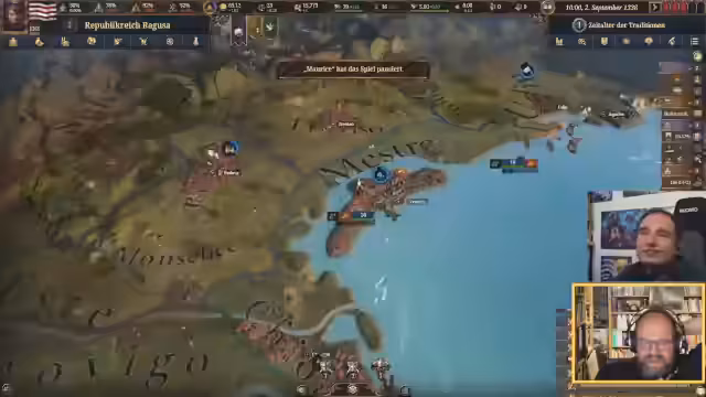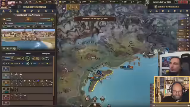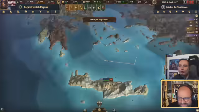 03:20:43Maurice Weber startet seine EU5-Reise als Doge Francesco Dandolo von Venedig, einer Handelsrepublik, die strategisch zwischen Italien und dem östlichen Mittelmeer positioniert ist. Steinwallen, als beratender Vasall, erklärt die Besonderheiten Venedigs, darunter die historischen Konflikte mit Byzanz und die zukünftige Bedrohung durch die Osmanen. Eine frühe strategische Entscheidung ist die Abtretung kleiner, schwer zu verwaltender Inselprovinzen an den Vasallen Kreta (Republikreich Candia), um die Kontrolle zu optimieren und die eigene Verwaltung zu vereinfachen. Dies minimiert den Aufwand für Maurice und ermöglicht es ihm, sich auf die Kernmechaniken des Spiels zu konzentrieren, während er die komplexen Beziehungen und Herausforderungen Venedigs erkundet.