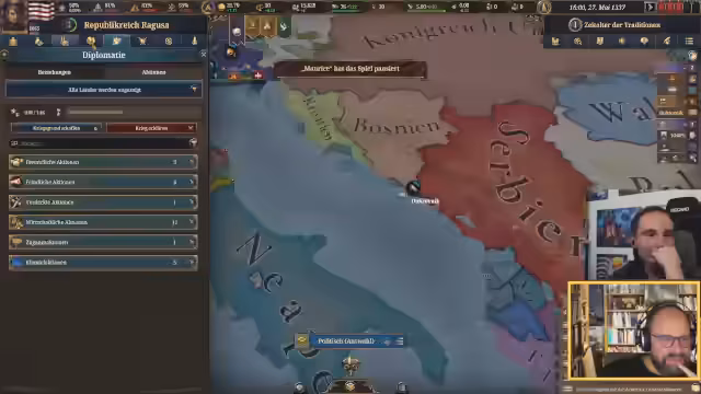 06:03:19Der Streamer diskutiert die Herausforderungen und Strategien zur Verbesserung diplomatischer Beziehungen in EU5, insbesondere im Kontext des Handels. Es wird erörtert, wie man den diplomatischen Ruf steigert, um Beziehungen schneller zu verbessern und Handelsstuben in anderen Märkten zu errichten. Die Bedeutung von Kabinettsaktionen und Privilegien zur Beschleunigung dieses Prozesses wird hervorgehoben. Ein konkretes Beispiel ist der Versuch, Beziehungen zu italienischen Staaten wie Mailand zu verbessern, um Zugang zu deren Märkten zu erhalten, wobei die Notwendigkeit einer Küstenstadt für Handelsstuben und die Meinung anderer Staaten eine Rolle spielen. Die Zuschauer im Chat geben hilfreiche Tipps, etwa zur Sortierung nach Meinung im Diplomatiemenü, obwohl aktuell keine freien Diplomaten zur Verfügung stehen. Das langfristige Ziel ist es, die Meinung von Klientelstaaten zu verbessern, um Rebellionen zu verhindern und den eigenen Einfluss zu sichern. Die Verbesserung des Diplomatierufs durch Kabinettsaktionen wird als wichtiger Schritt zur Effizienzsteigerung der Beziehungsverbesserung betrachtet.