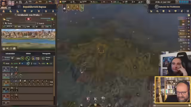 05:14:09Nach dem Krieg liegt der Fokus auf der Stärkung der Wirtschaft und Handelskraft. Es wird beschlossen, Märkte auszubauen, insbesondere in Venedig, wo bereits zwei Juweliere gebaut wurden, was den Profit dieser Gebäude reduziert hat. Es wird festgestellt, dass in Großstädten zwei Gebäude parallel gebaut werden können, während in Dörfern nur eines möglich ist. Die Adligen in Venedig besitzen keine Sondergebäude, die Kleriker hingegen einen Tempel, der das Kontrollmaximum erhöht. Es wird überlegt, ein Krankenhaus zu bauen, da die Pest bald erwartet wird, und eine Schneiderzunft für mehr Profit. Die Wahlverwaltung nach dem Tod des Dogen und die Notwendigkeit eines neuen Admirals werden ebenfalls thematisiert, wobei ein Kandidat mit guter Diplomatie und Militär gesucht wird.