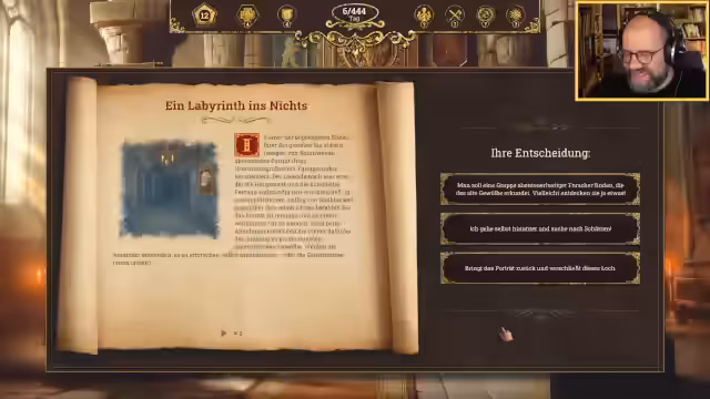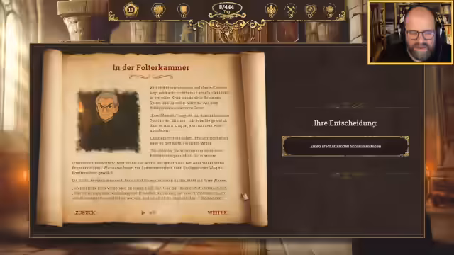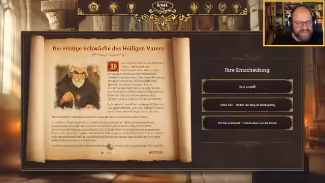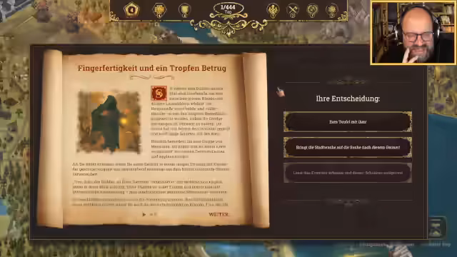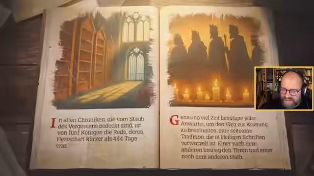 01:31:46Während General Badarian krank ist und vermutlich von einem mysteriösen Brunnenvergifter heimgesucht wird, muss der Streamer über einen betrunkenen Wachter urteilen. Die milde Straffreiheit scheint Konsequenzen zu haben. Die Interaktion mit dem Heiligen Vater Lumiel verschärft sich durch eine Partie Schach. Lumiel, ein Meister des Spiels, droht zu verlieren und entpuppt sich als geheimnisvoller Gegner mit einer persönlichen Agenda.