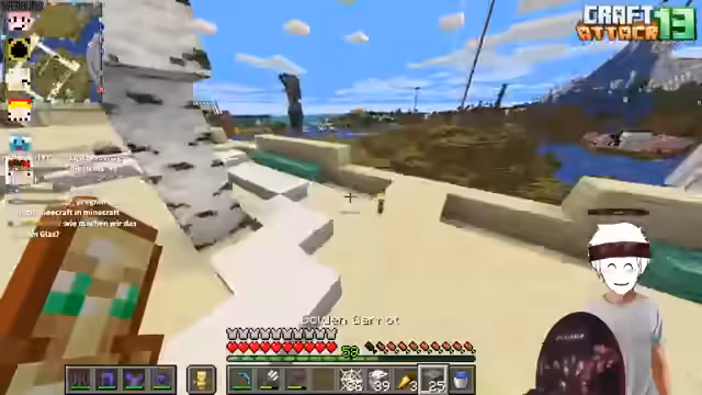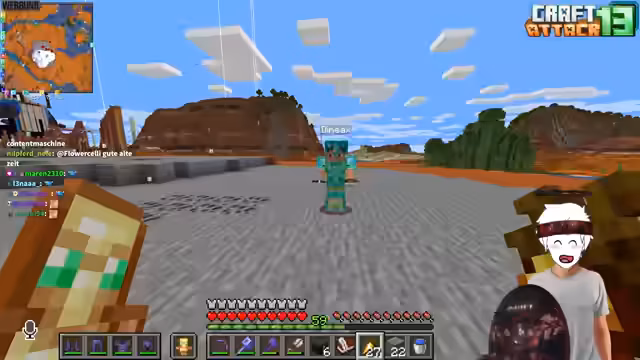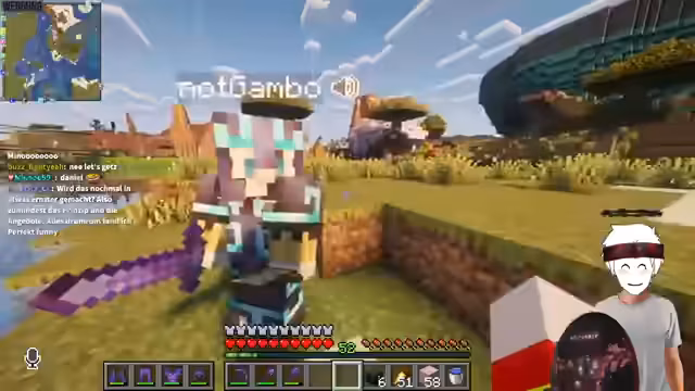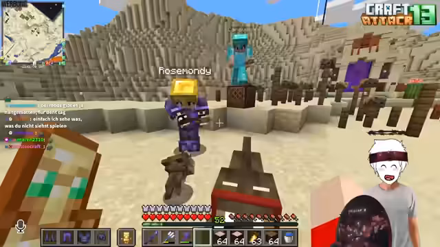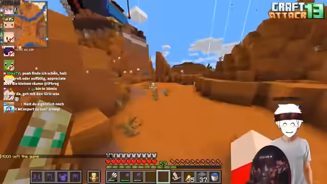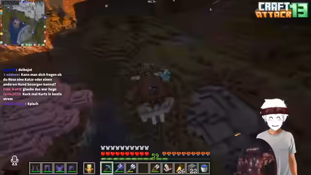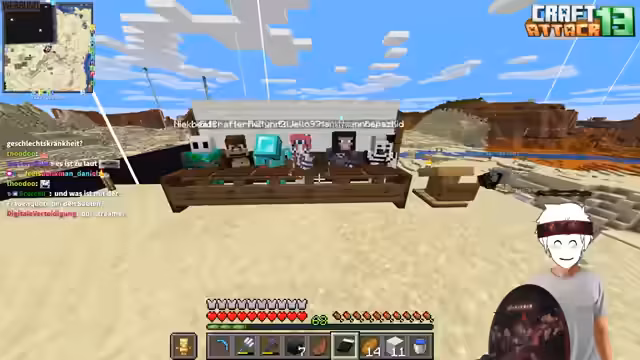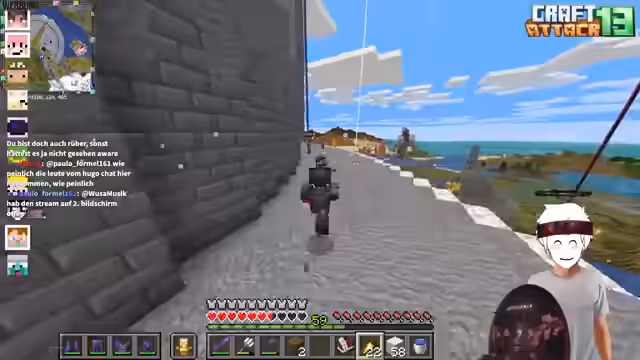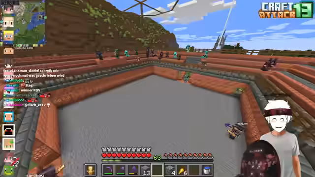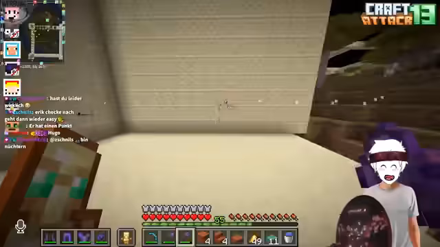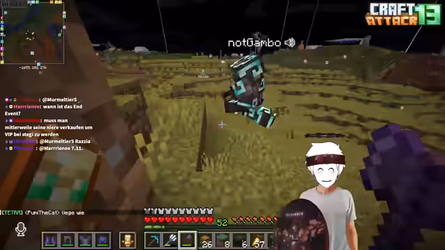 04:14:30Nach den Kanonenangriffen entwickelt sich eine Manhunt-Situation, bei der die Spieler Jagd auf Fabo machen. Es kommt zu einem hitzigen Schlagabtausch zwischen Fabo und Gambo, bei dem Gambo Fabo herausfordert und seine Kampffähigkeiten in Frage stellt. Die Diskussion eskaliert zu einem Kampf der Titanen, bei dem die Spieler ihre Schwerter vergleichen und sich gegenseitig provozieren. Niki Stemmler wird ebenfalls in die PvP-Auseinandersetzungen hineingezogen und wird zum Ziel einer Gruppenjagd. Trotz seiner Versuche, sich zu verteidigen und seine Null-Tode-Statistik zu halten, wird er von den anderen Spielern gejagt. Die Stimmung ist ausgelassen und kompetitiv, während die Spieler sich gegenseitig herausfordern und versuchen, ihre Gegner zu besiegen. Es kommt zu weiteren Diskussionen über Spielmechaniken wie Totems und Cobwebs, die für PvP-Kämpfe relevant sind.