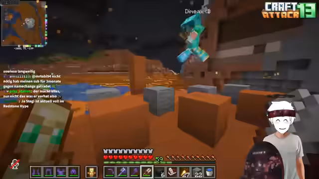07:35:24Der Streamer berichtet von seinem Baustil auf dem Craft-Attack-Server, da er weit entfernt von anderen Spielern baut, um nicht gestört zu werden. Er zeigt einem Mitspieler seine neue Base, die seit dem letzten Besuch deutlich gewachsen ist. Bei der Vorführung kommt es zu einem unglücklichen Zwischenfall, als er von einem Creeper getötet wird, nachdem er sich absichtlich leicht ausgerüstet hat, um sterben zu können.