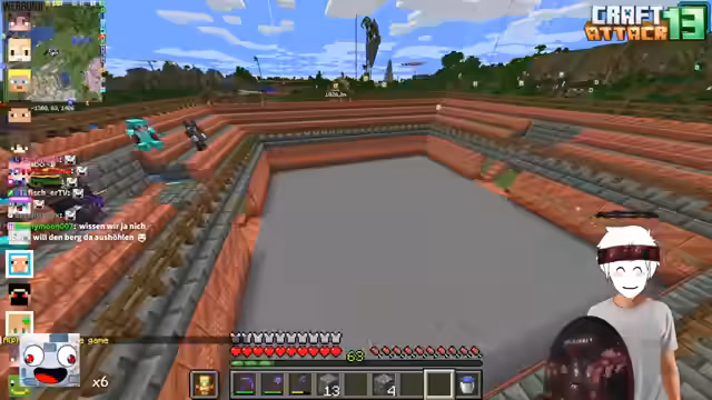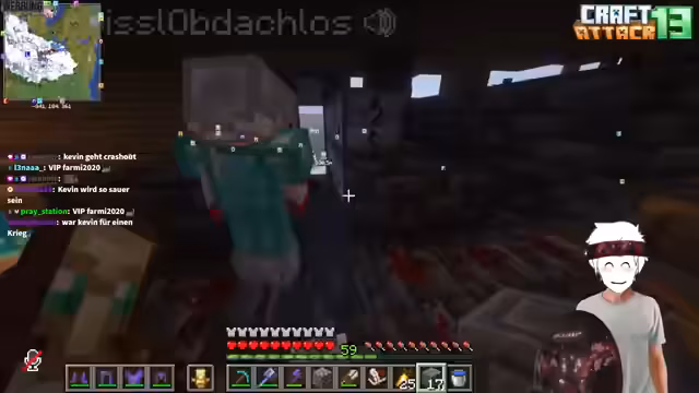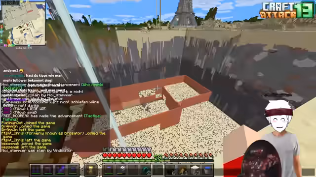04:02:14Nachdem die TNT-Kanone endlich erfolgreich Kevins Basis getroffen hat und ein Loch im oberen Durchgang verursacht hat, planen die Spieler weitere Angriffe. Sie etablieren eine Kommunikationsstrategie mit Walkie-Talkies, um die Schüsse zu koordinieren und die Auswirkungen zu überwachen. Es wird enthüllt, dass Heiko den Auftrag für den Bau der Kanone gegeben hat, um Kevins Basis anzugreifen, und sogar Isa's Haus ins Visier nehmen wollte. Isa's Haus ist jedoch aufgrund seiner schrägen Bauweise schwer zu treffen. Die Spieler sind überrascht von Heikos Aggressivität und fordern weitere Informationen über seine Beweggründe. Trotz der anfänglichen Zerstörung ist der Impact der Kanone nicht so massiv wie erwartet, aber die Möglichkeit, Dauerfeuer zu geben, wird diskutiert. Die Kanone wird als beeindruckende Konstruktion gelobt, die eine große Reichweite von 300 Blöcken hat und strategische Angriffe auf verschiedene Bereiche der Basis ermöglicht.