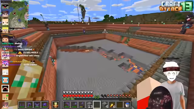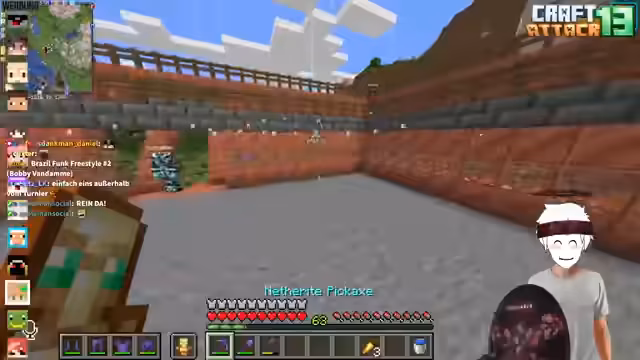 03:14:09Der Streamer entdeckt überraschend neue Bauten in seiner Nähe, darunter eine Schneelandschaft und eine Basis, die er zum ersten Mal sieht. Er fragt sich, wer dort baut und vermutet, dass es Winnie sein könnte. Es stellt sich heraus, dass Dima dort baut und verschiedene Biome aus einem Spiel nachbildet. Dima erklärt, dass er ursprünglich vier Biome bauen wollte, aber aufgrund des hohen Aufwands wahrscheinlich nur zwei oder drei sehr detaillierte Biome umsetzen wird, darunter ein Lava-Biom. Die Diskussion wechselt zu einem geplanten Minecraft-Quiz, das der Streamer veranstalten möchte. Dima wird eingeladen, daran teilzunehmen, da er als geeigneter Charakter mit Minecraft-Wissen und Verständnis für Formatabläufe gilt. Das Quiz soll in Minecraft stattfinden und sich nicht nur auf Wiki-Artikel beschränken, sondern auch abstrakte Zusammenhänge und Real-Life-Bezüge beinhalten. Dima plant seinerseits ein Golf-Event in Craft Attack, bei dem Teams abwechselnd den Golfschläger bedienen. Er fragt den Streamer nach Redstone-Kenntnissen für einen Randomizer, der die Reihenfolge der Spieler bestimmt. Es wird erklärt, dass ein Dropper bereits einen Randomizer-Effekt hat und somit einfach umzusetzen ist.