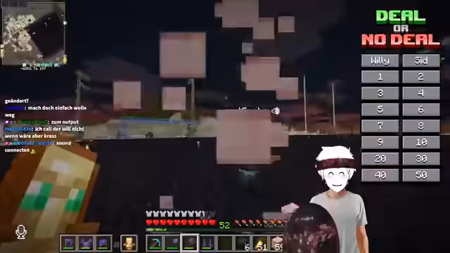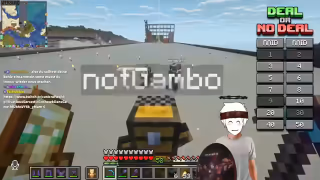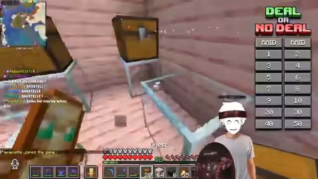 12:27:17Nachdem Heiko endlich an der Basis eingetroffen war, wurde das eigentliche Event gestartet: ein Spiel 'Deal or No Deal'. Der Streamer fungierte als Moderator und kündigte eine Assistentin an, die bei der Organisation helfen würde. Heiko durfte eine Kiste auswählen, die mit einem Emerald-Block versiegelt wurde. Die Regeln wurden erklärt: Es gibt einen Hauptpreis von 50 Subs, andere Geldbeträge und zwei 'Nieten', die eine Verpflichtung zum Raiden beinhalten. Ein 'Banker' würde im Verlauf des Spiels Angebote machen.