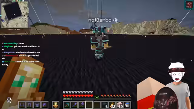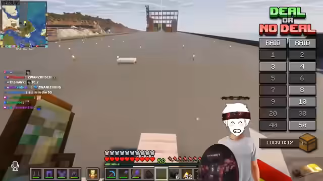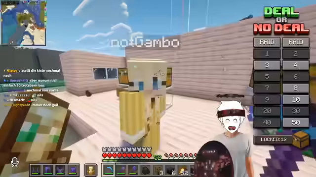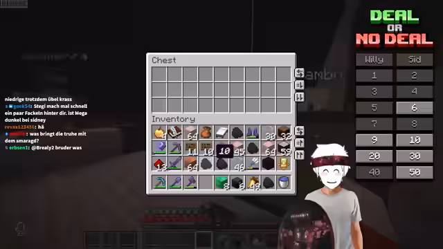 11:15:19Der Streamer bespricht mit Gambo die Regeln und die Umsetzung des "Deal or No Deal"-Formats. Gambo erklärt die Funktionsweise des Originalformats, bei dem ein Koffer ausgewählt und dann nach und nach andere Koffer geöffnet werden, um die Wahrscheinlichkeit der verbleibenden Beträge zu ermitteln. Der "Banker" macht dann Angebote, um den Spieler aus dem Spiel zu kaufen. Sie entscheiden sich für eine "trashige" und weniger ernsthafte Version des Spiels. Es wird auch ein spezieller Skin für Gambo besprochen, der als "Kiste" fungieren soll, die Items droppt, wenn sie geöffnet wird. Des Weiteren wird ein Problem mit einem Netherportal diskutiert, das zu einem Chunkloader von Carawass führt und die Spieler an unerwarteten Orten landen lässt. Es wird überlegt, wie dieses Problem behoben werden kann, entweder durch Repositionierung des Chunkloaders im Nether oder durch das Entfernen des Portals und das Bauen eines Enderperlen-Chunk-Loaders. Der Streamer entscheidet sich vorerst für ein Schild vor dem Portal, um weitere Verwirrung zu vermeiden, und plant, später eine Lösung zu finden.
