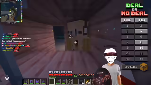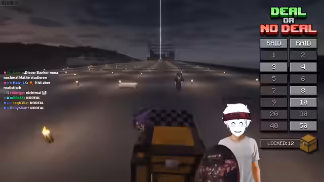 12:27:17Heiko trifft ein und Stegi begrüßt ihn zum Spiel "Deal or No Deal". Stegi erklärt die Regeln: Heiko wählt eine Kiste aus, die versiegelt wird. Anschließend öffnet er nacheinander andere Kisten, und nach bestimmten Intervallen meldet sich ein "Banker" (gespielt von Gambo, der durch Skinwechsel die Rolle wechselt) mit einem Angebot für Heikos Kiste. Die Hauptpreise reichen von 1 bis 50 Subs, wobei auch zwei Nieten enthalten sind, die Heiko dazu verpflichten würden, Stegi zu raiden. Heiko wählt die Kiste Nummer 12. Die ersten Kisten werden geöffnet, darunter die Nummern 19 (30 Subs), 13 (2 Subs), 8 (1 Sub), 4 (9 Subs) und 6 (7 Subs). Die Spannung steigt, da bereits einige niedrigere und mittlere Beträge aus dem Spiel genommen wurden. Nach den ersten fünf geöffneten Kisten klingelt das Telefon, und der Banker macht das erste Angebot, was die Spieler und den Chat in Aufregung versetzt.