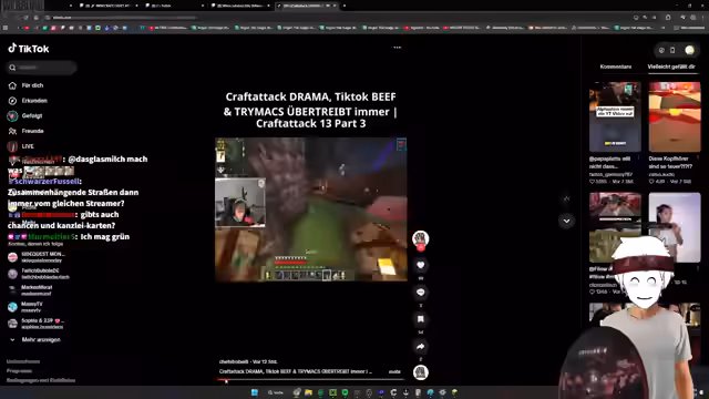 13:07:43Nach dem erfolgreichen Deal und der Enthüllung des Inhalts der letzten Kiste, die sich als Niete herausstellte, lobte der Streamer Heikos Spielweise und bedankte sich bei Merle für ihre Unterstützung. Die Teilnehmer reflektierten über das Format, das als 'geil' und 'krank' beschrieben wurde, obwohl es auch 'anstrengend' war. Es wurde über die Möglichkeit gesprochen, das Format als Video hochzuladen, und die Herausforderungen des spontanen Aufbaus und der Koordination der verschiedenen Rollen wurden thematisiert. Der Streamer und sein Team zeigten sich begeistert von der Interaktion mit dem Chat und den humorvollen Elementen der Show. Es gab auch Diskussionen über mögliche Verbesserungen für zukünftige Ausgaben, insbesondere hinsichtlich der Reveal-Methoden und der technischen Umsetzung von Skin-Wechseln und Redstone-Schaltungen.