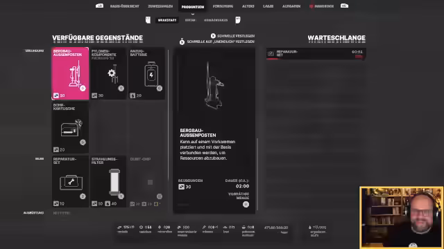 02:15:29Ein entscheidender Durchbruch erfolgt durch einen Vergleich der Effizienz zwischen dem Abbau an der Oberfläche und dem Betrieb von Bergbauaußenposten. Es stellt sich heraus, dass die manuelle Förderung durch den Spieler weitaus effizienter ist als die automatischen Außenposten. Diese Erkenntnis führt zu einer grundlegenden Neuausrichtung der Strategie. Der Fokus verlagert sich von der Errichtung weiterer Außenposten auf die direkte Ressourcengewinnung an der Oberfläche, um Ressourcen wie organische Stoffe und Metalle schneller zu beschaffen und die Prioritäten bei der Produktion neu zu ordnen.