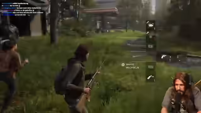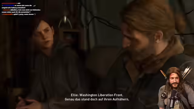 02:18:54Der Stream beginnt mit humorvollen Kommentaren zu einer fiktiven Gasmasken-Bong und einer Diskussion über illegale Handlungen im Stream. Die Szene wechselt dann zu einem dramatischen Fluchtversuch mit Figuren wie Ellie und Abby, die sich vor Verfolgern in einer dystopischen Umgebung durchschlagen müssen. Ein beinahe misslungener Fluchtversuch und ein Kampf mit einem Clicker, dem er nur knapp entkommt, leiten den Einstieg in die eigentliche Handlung ein.