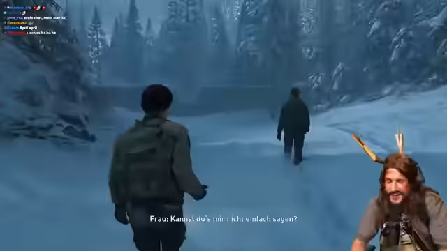 00:36:02Im Spiel wird die Szene in einer Schneelandschaft fortgesetzt, in der die Protagonistin Ellie und ihr Freund Joel unterwegs sind. Der Streamer betont die detailreiche und lebendige Welt von Naughty Dog und kommentiert das Gameplay positiv. Ellie trifft auf Joel und Dina, eine Freundin, und es kommt zu einer persönlichen Unterhaltung. Der Streamer wechselt kurz das Outfit, und es entwickelt sich ein Dialog zwischen den Charakteren über Beziehungen und die aktuelle Situation in der postapokalyptischen Welt.