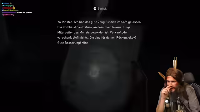 01:53:50Ellie und Dina entdecken ein Versteck eines Mannes namens Eugene in einem Laden. Der Streamer ist von dem detaillierten und atmosphärischen Aufbau der Location begeistert und kommentiert die liebevollen Details, wie eine selbstgebaute Anlage. Sie durchsuchen das Versteck auf der Suche nach wichtigen Gegenständen und finden einen Safe, dessen Geheimnis sie entschlüsseln müssen. Dabei wird die Neugier auf die Geschichte hinter Eugene geweckt.