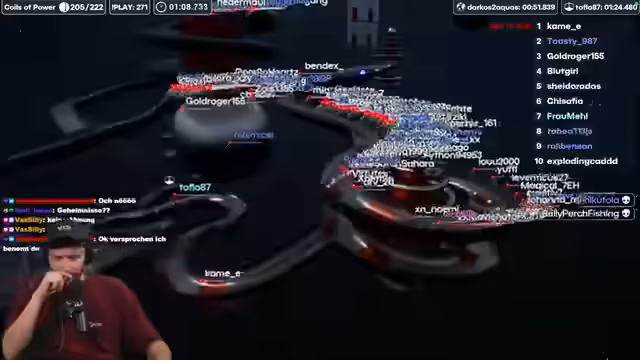 02:39:23Die Spieler befinden sich in einer herausfordernden Situation, in der Kalle, ein Mitglied der Crew, gerade mit der Fähre unterwegs ist, um die anderen zu holen. Währenddessen müssen die verbleibenden Spieler ihr Fahrzeug, das stark beschädigt ist, reparieren. Max navigiert, während ein anderer Spieler versucht, die Stoßstange zu richten. Es wird diskutiert, wie das Fahrzeug am besten rückwärts an eine Klippe manövriert werden kann, um es herunterzulassen. Dabei gehen wichtige Haken verloren, die eigentlich zum Sichern des Fahrzeugs benötigt werden. Trotzdem wird beschlossen, den Versuch zu wagen. Kalle wird vermisst, während die anderen versuchen, Sterzik zu erreichen, der ebenfalls in der Nähe zu sein scheint. Das Spiel erlaubt maximal vier Spieler, was die aktuelle Gruppengröße betrifft.