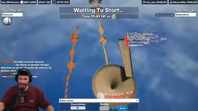 00:07:30Vor dem eigentlichen Spiel gibt es rege Interaktion mit dem Chat. Dank zahlreacher Spenden und Subs startet ein sogenannter Hype-Train schnell auf hohem Level. Der Streamer bedankt sich für die Unterstützung und stellt eine Frage zur technischen Qualität des letzten Adventskalender Streams, um Feedback zu erhalten. Da das Hauptspiel länger auf sich warten lässt, wird als schnelles Zwischenspiel ein Murmelrennen organisiert, bei dem alle Chatter mitmachen können.
