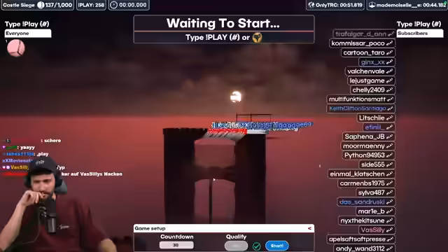 00:05:03Der Streamer kündigt mit großer Freude an, dass er heute Abend endlich mit Kalle, Vasili und Hanno das Spiel 'Are We There Yet?' spielen wird, nachdem sie dies seit fünf Wochen aufgrund verschiedener Terminkonflikte nicht geschafft haben. Das Spiel soll in etwa einer Dreiviertelstunde beginnen. Zur Überbrückung der Wartezeit schlägt er vor, eine Runde 'Marbles on Stream' zu spielen. Er erklärt die Regeln des Spiels, bei dem die Zuschauer durch Eingabe von '!play' im Chat teilnehmen können, um ihre Murmeln durch eine Bahn zu jagen. Es werden auch Kanalwetten zu den Marbles-Runden angeboten, bei denen die Zuschauer auf das Abschneiden der Teilnehmer, insbesondere von Vasili, wetten können. Diese interaktiven Elemente sollen die Wartezeit verkürzen und die Community einbinden.