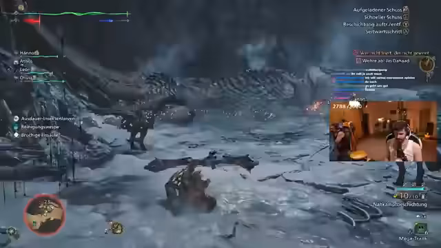 11:06:47Der Streamer kritisiert die Dialoge im Spiel und vergleicht sie mit Borderlands. Er kommentiert, dass das Monster heftig aussieht und dass Leon ihn schon erledigt hat. Der Streamer bringt Feuerschaden mit und ist bereits auf dem Monster drauf. Er fragt, wie man sagt, wenn man eine Meinung hat, die andere nicht teilen. Der Streamer kommentiert das Aussehen des Monsters und vergleicht es mit Saurons Mund. Er macht das Bein des Monsters kaputt und kommentiert, dass er froh ist, rechtzeitig zur Treibjagd gekommen zu sein. Der Streamer lobt das Leveldesign des Spiels und schießt sich in die Eier. Er schießt dem Monster ins Auge und in den Fuß und kommentiert, dass es sick war. Der Streamer kommentiert, dass man das Monster überall treffen kann und dass es ein geiler Typ ist. Das Monster fällt und der Streamer kommentiert, dass es Kämme auf dem Rücken hat. Der Streamer kommentiert, dass das Monster eine Eisplatte gebrochen hat und dass sein Vorderbein gebrochen ist. Es wird auf das Herz geschossen. Der Streamer kommentiert, dass er sich auf die Kaltjagd freut. Der Streamer fragt, ob jemand etwas zum Schießen hat und kommentiert, dass er einen riesigen Eisbauch auf das Monster fallen lassen kann. Er lässt ihn fallen und kommentiert, dass es ein 300er der Witz war. Der Streamer fragt, ob sie alle tot sind und kommentiert, dass es offensichtlich war, dass sie Deckung suchen mussten.