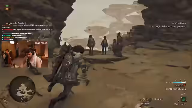 02:37:08Der Streamer kommentiert, dass er dem Monster etwas in den 'Arsch geschenkt' hat. Er fragt, wie man die Waffe wechselt und erfährt, dass dies auf dem Reittier möglich ist. Es wird festgestellt, dass der Waffenwechsel einen Cooldown hat. Der Streamer hat technische Probleme und sein Bogen schießt unkontrolliert. Er fragt, wie man die Waffe wegsteckt und springt. Die Gruppe versucht, eine Falle vom Baum zu holen. Der Streamer hat weiterhin Probleme mit der Steuerung. Er kommentiert, dass etwas auf seiner Tastatur liegt, obwohl das nicht der Fall ist. Der Schwanz des Monsters wird gebrochen. Der Streamer geht kurz wetzen und findet es nervig, dass er nicht automatisch die Waffe zieht, wenn er B drückt. Er bemerkt eine Wunde auf dem Kopf des Monsters und greift an. Der Streamer hatte Verbindungsprobleme, ist aber wieder im Spiel. Die Gruppe greift das Monster gemeinsam an und verursacht Schaden. Der Schwanz des Monsters wird abgetrennt und gelootet. Die Gruppe wechselt das Ziel und nimmt es mit einem Bären auf.