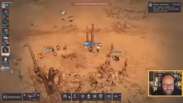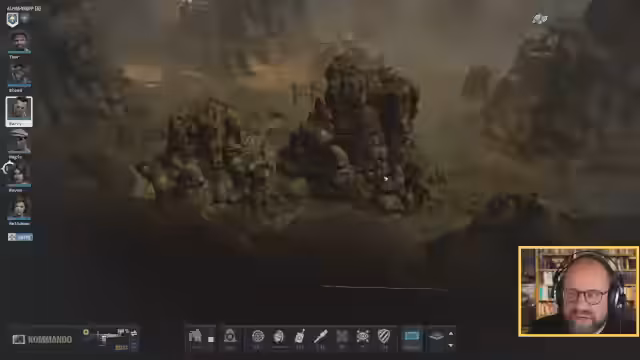 01:39:37Das Team um Barry Unger kämpft sich durch ein unübersichtliches Gelände. Barry liegt verletzt am Boden, nachdem er unter Feindbeschuss geraten ist. Blutspuren deuten auf weiterlaufende Kämpfe hin. Nachdem Barry wieder auf den Beinen ist, wird das Gelände vorsichtig erkundet. Es wird ein Aufzug entdeckt, der die Richtung vorgibt. Eine riesige Höhle erfordert höchste Konzentration, da Deckung nur spärlich vorhanden ist. Die Söldner müssen sich vorsichtig bewegen und auf gegnerische Einheiten achten, die jederzeit auftauchen könnten.