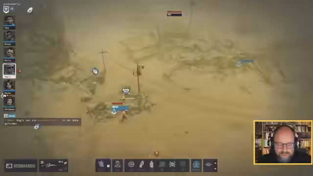 01:42:34Bei der Erkundung wird eine schlimme Fehleinschätzung gemacht. Barry tritt versehentlich auf eine Mine und verletzt sich schwer. Das Team reagiert schnell, indem es sich zurückzieht und die Situation sichert. Die Spielmechanik, die vorab nicht anzeigt, wie viele Gegner in einem Sektor warten, wird als störend empfunden, da sie das Vorgehen zusätzlich erschwert. Die Spielleiterin konzentriert sich darauf, den taktischen Fokus wiederzuerlangen und die Lage neu zu bewerten, nachdem der erste Schock über die Verletzung von Barry verflogen ist.