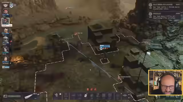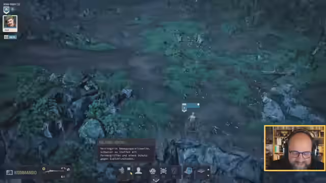 00:54:47Der Streamer startet ins Gameplay und stellt den aktuellen Stand der Mission dar. Das Ziel ist die Eroberung des letzten Lagers der Putschisten, um den Präsidenten zu befreien. Das A-Team soll in einem Gebirgsgebiet den Hauptangerkämpfen, während das B-Team Nebenaufgaben erledigt, wie die Suche nach einem Grab oder die Erkundung einer Küste. Eine wichtige neue Nebenaufgabe ist die Ermordung eines Verantwortlichen für den Tod von zwei Logistikern, für den der Söldner Shadow mit seinem Talent fürs Schleichen beauftragt wird. Der Plan ist, dass dieser sich unbemerkt an sein Ziel heranschleicht und es mit einem Messer tötet.
