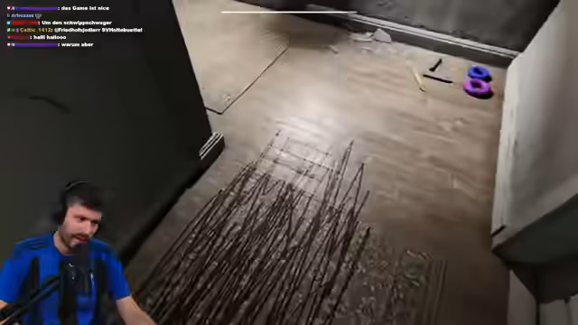 00:30:50Der Stream startet eine Kanalwette, bei der Zuschauer nur mit einem Ausrufezeichen 'play' im Chat teilnehmen können, um dem Streamer zu helfen, in die Top 50 zu kommen. Im Horrorspiel Unmourned sucht Jason nun nach dem Gegenstand des Kindes, einem Teddy, im Kinderzimmer. Die Atmosphäre wird durch einen Jumpscare intensiviert. Der Streamer muss dabei seine 'Sanity' aufbauen und wundert sich über die unkonventionelle Einrichtung des pinken Kinderzimmers, das wie ein Theater oder ein Opernsaal wirkt.