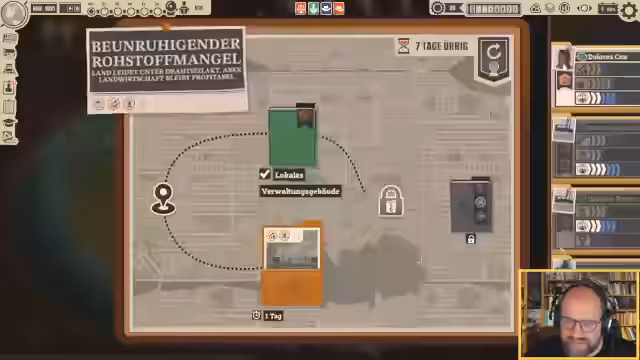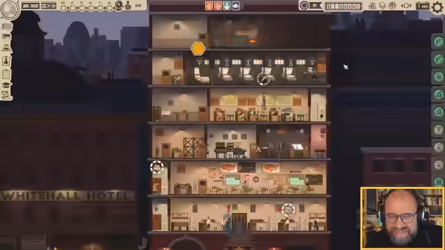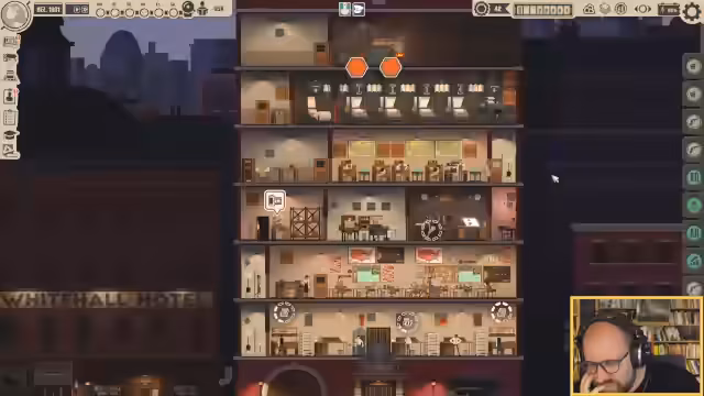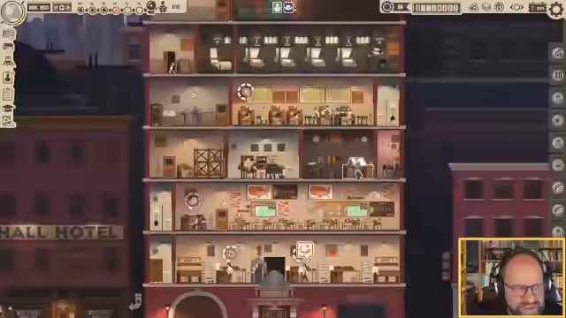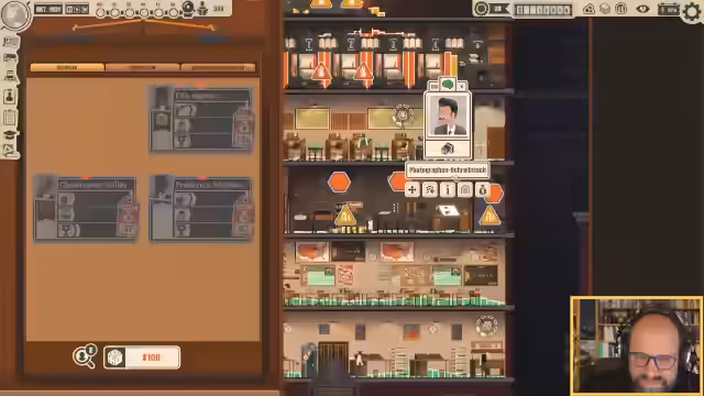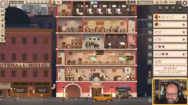 02:38:29Es erfolgt eine intensive Diskussion über den Ausbau des Bürogebäudes. Der Spieler erwägt die Installation eines Aufzugs oder Rohrpostsystems, analysiert deren Auswirkungen auf Arbeitsabläufe und Raumplanung. Letztlich wird der Umbau um eine Woche verschoben, um durch gezielte Einflusspunkte beide Systeme gleichzeitig realisieren zu können, statt inkrementelle Lösungen umzusetzen.
