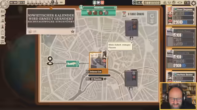 01:08:05Im Spiel wird die Mafia-Mission priorisiert, die mindestens 303.000 Zeitungsverkäufe erfordert. Der Host setzt inhaltlich auf Kriminalgeschichten, lehnt aber riskante Einsätze (z.B. Verletzungsgefahr) ab. Reportage-Themen wie Schmiergeldskandale, Unruhen und Korruptionsermittlungen werden verteilt, wobei Personalmangel durch Verletzungen entsteht. Gleichzeitig wird die neue Fotografie-Abteilung beobachtet, deren Funktionsweise noch unklar bleibt. Ressourcenmanagement (Papier, Anzeigen) und mögliche Preisanpassungen der Zeitung werden als strategische Hebel diskutiert.