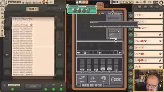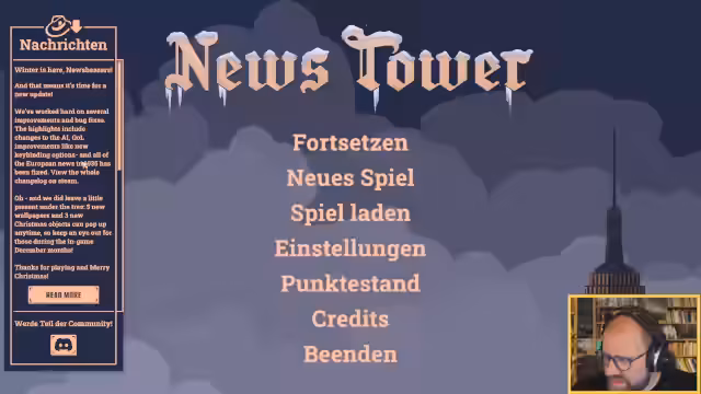 00:36:09Beim Spiel 'Newstower' wird die Einführung von Fotografie im 'Wallstone Journal' umgesetzt. Dafür ist ein Umbau der Redaktionsräume nötig: Eine neue Etage wird gekauft, um Fotolabor, Repro-Kamera und Graveur unterzubringen. Der Host diskutiert Platzierungsoptionen mit dem Chat, priorisiert Nähe zur Montageabteilung und setzt schließlich industrielle Tapeten/Geruchsschutz ein. Mitarbeiter werden eingestellt, während Upgrades zunächst zurückgestellt werden. Der Prozess der Bildentwicklung (Fotograf → Dunkelkammer → Repro → Graveur → Montage) wird erörtert, aber praktisch noch nicht getestet. Parallel wird der Zeitungspreis strategisch analysiert – eine zuvor übersehene Spielmechanik, die Bonusränge bei bestimmten Preispunkten ermöglicht.