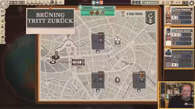 02:55:21In der heißen Phase der Ausgabenerstellung werden Reporter wie Rose Chapman und Evelyn Fischer auf beunruhigende Geschichten angesetzt – etwa einen Eisenbahnraub oder soziale Krisen. Gleichzeitig werden Europa-Berichte (u.a. zu Deutschlands Reparationskrise) mit Flugzeug-Ressourcen priorisiert. Die Balance zwischen Einflussmaximierung, Gegenstandserwerb (z.B. Weihnachtskranz) und Boykottrisiken bestimmt die Ressourcenverteilung.