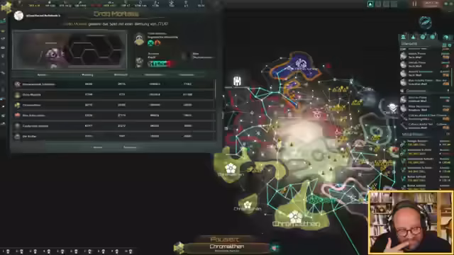 07:09:08Als das Zäpfchen zur Abreise startet, wird es von einer mächtigen Tarnflotte aufgehalten. Es wird enthüllt, dass das Zäpfchen die gesamte Galaxie opfern wollte, um in eine neue Dimension zu reisen. Nach diesem schrecklichen Erkenntnis greifen die verbliebenen Mächte das Zäpfchen an, um diese Bedrohung für das Leben zu stoppen. Günther, der bei den Chromalisten geblieben ist, zutiefst erschüttert von diesen Ereignissen, erlebt den finalen Abschied von seiner Freundin Gudrun, die im Kampf gefallen ist. Der Stream endet damit, dass die Fraktionen ihre finalen Entscheidungen treffen, während die verbleibende Macht Ordo Mortales mit einer riesigen Flotte noch eine letzte Bedrohung für die Galaxis darstellt.