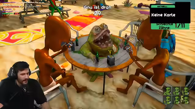 05:08:01Die Partie in Bogus Binted entwickelt sich zu einer emotionalen und chaotischen Erfahrung. Die Spieler verlieren Gliedmaßen, interagieren durch Spucken und beschimpfungen, und das Spielprinzip des Ziehen von schlechten Zähnen sorgt für ständige Spannung und cliffhängerartige Situationen. Die Kommunikation ist von Eifer, Wettbewerb und absurden Kommentaren geprägt, was die Runde zu einem Höhepunkt des Streams macht.