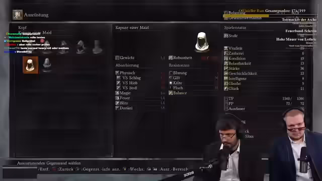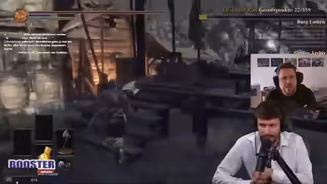 00:17:29Der Streamer schaltet zu anderen Teilnehmern des Soulkeepers-Events, wie Skui und Froschmädchen, um deren Runs live zu kommentieren. Während Skui einen gezielten und geübten Riesenkampf zeigt, wird Froschmädchen bei einem Kampf gegen den invasiven Tempelritter Hodrick zugeschaut. Ein Höhepunkt ist die aufwändige und dramatische Analyse des Kampfes, der lange dauert und bei dem Froschmädchen knapp am Sieg scheitert. Dies unterstreicht die Spannung des Community-Events.