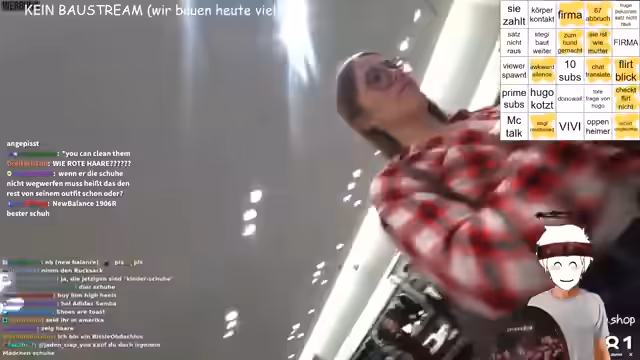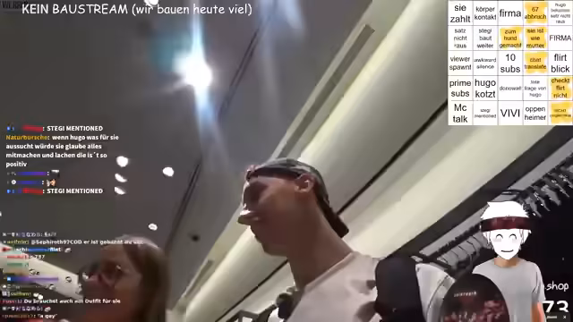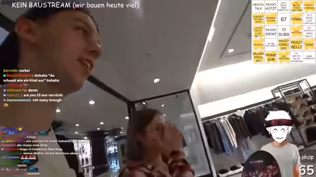 04:56:41Hugo wechselt mehrmals die Kleidung und probiert verschiedene Outfits an. Jeder Wechsel wird im Stream ausführlich diskutiert und kommentiert. Die Verkäuferin und der Streamer bewerten Hugos neue Look. Hugo wirkt überfordert und unterwürfig, was im Stream als sehr unterhaltsam und gleichzeitig befremdlich wahrgenommen wird. Er wird dazu angehalten, riskanter und stilvoller zu sein.