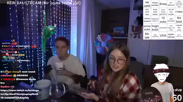 04:20:17Die Konversation wechselt zu einem persönlichen Thema, als die Verkäuferin Hugo nach seinen körperlichen Vorlieben fragt. Dies führt zu einem Bingo-Spiel, in dem die Zuschauer im Chat Vorschläge machen. Hugo wird unter Druck gesetzt, seine Vorlieben zu preisgeben und verschiedene Outfits und Accessoires anzuprobieren, was zu humorvollen und unbehaglichen Situationen führt.