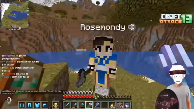 06:24:32Nach der technischen Klärung wird das Gespräch fortgesetzt. Der Streamer führt einen neuen Spieler, Willi, durch die Spielwelt, der zum ersten Mal bei Craft Attack dabei ist. Es wird ersichtlich, dass der Streamer und sein Begleiter eine sehr schwierige Startphase haben und nur wenige Ressourcen, wie zehn Kartoffeln, besitzen. Der Streamer und Willi erhalten von einem anderen Spieler, Dena, unerwartet viele Gegenstände als Geschenk, was jedoch aus Fairnessgründen abgelehnt wird.