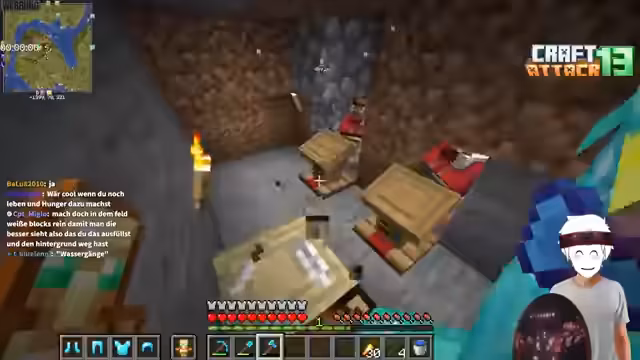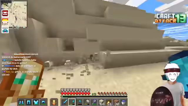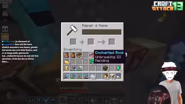01:11:57Zu Beginn des Streams wird der Stand der Eisenproduktion gezeigt, wobei der Streamer deutlich seine Unzufriedenheit über das Monopoly-Projekt ausdrückt und den Wunsch äußert, stattdessen mit Craft Attack zu beginnen. Er präsentiert erste Bauelemente, die als die ersten Grabsteine für das Craft Attack-Projekt dienen sollen, und zeigt eine im Bau befindliche Mob-Farm. Auch die erste Gewinnung von Diamanten wird erwähnt und im Inventar gezeigt.