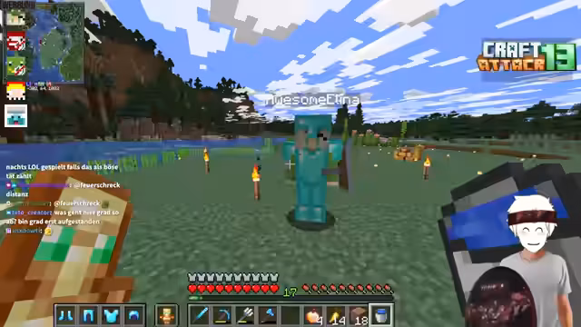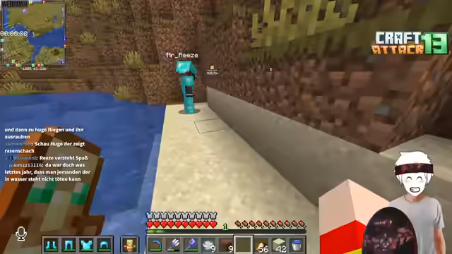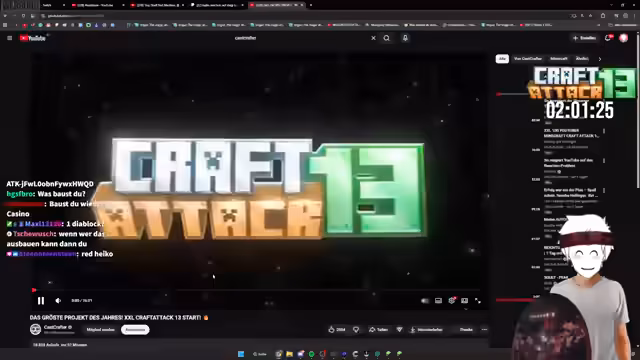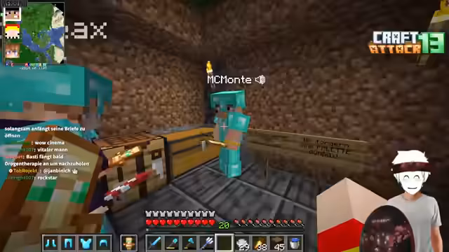 00:55:53Der Streamer betritt den Craft Attack 13-Server und startet mit den ersten Schritten. Er muss sein Start-Equipment wie Rüstung und Ressourcen farmen. Sein Nachbar Heiko Karscrafter wird erwähnt. Ein zentrales Element ist der mysteriöse Koffer, den er am Spawn findet. Dieses Item ist das wertvollste auf dem Server und darf in keine falschen Hände geraten. Sein Inhalt bleibt ein Geheimnis, das alle Teilnehmer schützen müssen, und wird zur treibenden Kraft für die ersten Aktionen und Interaktionen im Spiel.