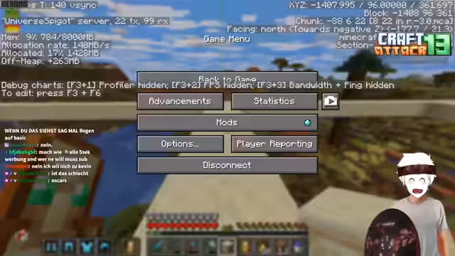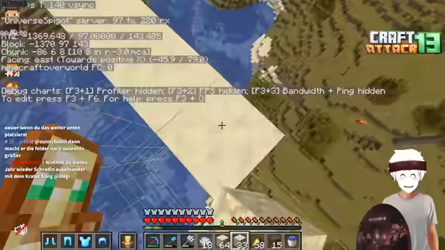 12:42:21Es wird auf das neue F3-Layout im Spiel eingegangen, das eine deutlich bessere Anpassbarkeit der angezeigten Informationen ermöglicht. Besonders die sichtbaren Border-Linien werden als 'Game-Changer' gelobt, da das Erkunden der Welt deutlich einfacher wird. Gleichzeitig wird ein Projekt für eine 'Eisenfarm' angedacht, da es bisher noch keine auf dem Server gibt. Es gibt Bedenken, dass eine Farm von einem anderen Spieler ('Fabo') möglicherweise nicht funktioniert. Die Pläne für das Casino-Projekt werden noch einmal angesprochen, wobei der Streamer seine kritische Haltung gegenüber dem Thema Glücksspiel für junge Zuschauer klarzumachen versucht.