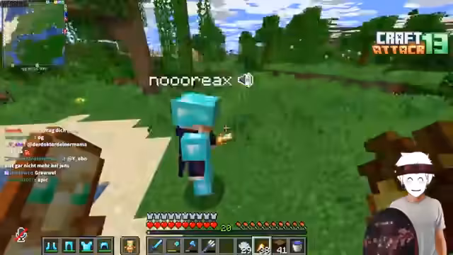 06:28:50Willi betritt den Craft-Attack-Server und interagiert mit Stegi. Es folgt ein großer Tauschhandel: Stegi erhält Diamanten, verzauberte Bücher und Bögen, während er im Gegenzug u.a. Melonensamen, Fleisch und einen gefundenen Gegenstand (wahrscheinlich eine Trankkomponente) abgibt. Stegi betont mehrfach, dass er sich kaum zurückhalten kann, um den Fortschritt des neuen Spielers nicht zu gefährden.