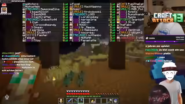 15:09:23Plötzlich wird ein mysteriöser Spieler namens Alphastein erwähnt, der seit 12 Stunden unter der Basis des Streamers buddelt und lautstark Farming-Sounds macht. Eine Gruppe von Streamern, darunter Kuba und Fabo, startet eine 'Jagd', um Alphastein zu finden und ihn zur Rede zu stellen. Nach längerer Suche und einem turbulenten Dialog wird Alphastein gefunden. Anstatt ihn anzugreifen, einigen sich die Beteiligten, das Problem diplomatisch zu lösen.