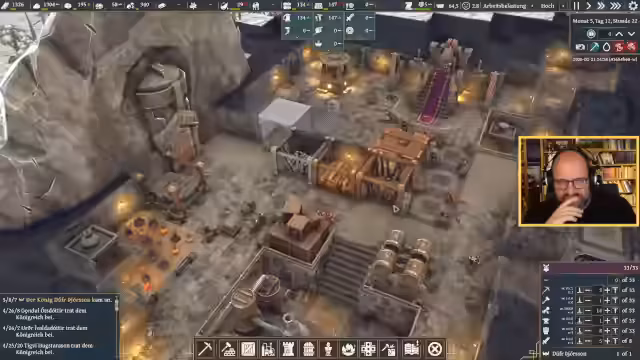 01:25:09Während des Spiels werden die Kernmechaniken von 'King of the Dwarfs' detailliert erklärt. Dazu gehören das Graben nach Ressourcen, die Anpassung der Arbeitslast der Zwerge, der Tagesablauf mit Ruhephasen und das Balancen-System der Wissenspunkte, das kontinuierlich gepflegt werden muss. Der Streamer beobachtet das Verhalten der Zwerge, die自主 spontaneously essen, trinken und schlafen, und beginnt, die Siedlung um Lager und neue Gebäude zu erweitern.