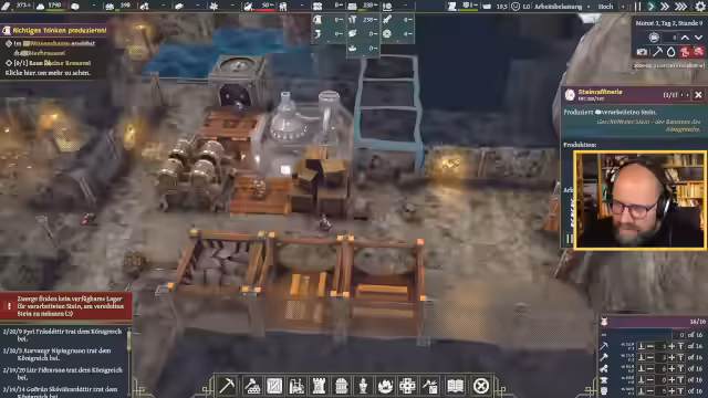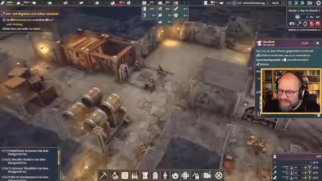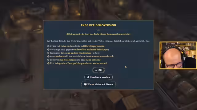 01:50:27Die Streamer beginnt mit den ersten beiden Demos, die sich beide mit dem Aufbau einer Zwergensiedlung befassen. Im ersten Spiel wird die Bewirtschaftung von Pilzen und die Zuweisung von Arbeitern fokussiert. Ziel ist es, Ressourcen wie Wasser, Pilze und Schlafplätze zu verwalten. Im zweiten Spiel wird das Bauen von Schlafflächen und das Verständnis für die Siedlungslogik erarbeitet. Die Herausforderung besteht darin, die Produktivität zu maximieren und die Zufriedenheit der Zwerge zu gewährleisten.