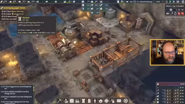 02:39:44Nach erfolgreicher Etablierung der Bierproduktion und des Eisenabbaus richtet sich der Fokus auf die Erweiterung der Siedlung. Um das Prestige zu erhöhen, werden Gebäude wie Steinsäulen und Statuen errichtet. Hauptziel ist der Bau eines Thronsaals, um den König begrüßen zu können. Dies erfordert eine massive Menge an Eisen und Steinen sowie die Freischaltung der entsprechenden Forschungspunkte.