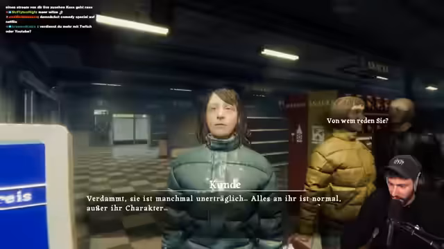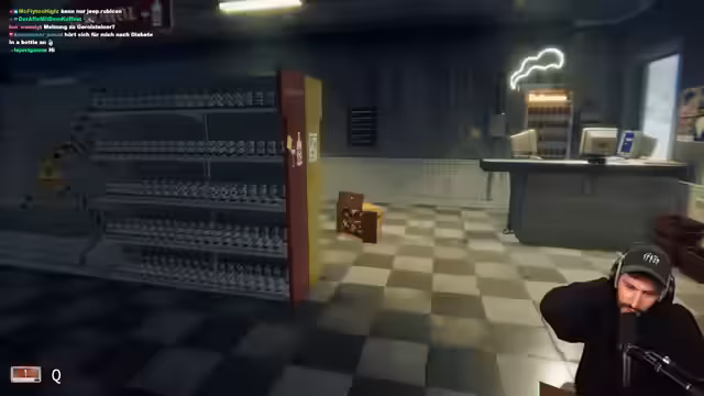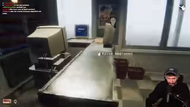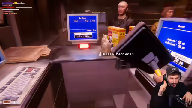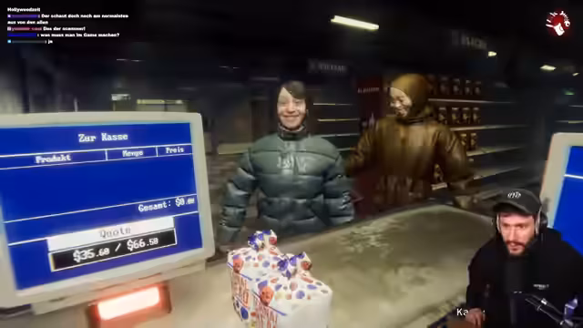 03:04:14Der Streamer simuliert den Verkauf im Laden und interagiert mit diversen, oft exzentrischen Kunden. Ein besoffener Kunde kauft Whisky und ein anderer klaut eine Flasche. Es kommt zu wiederkehrenden, surrealen Szenen, unter anderem mit einer Oma, die die Streamer bedrohen will, und einem mysteriösen, gelagerten Lappen. Der Streamer erhält traurigerweise eine 5,60 Euro Spende, aber der Empfänger ist leider nicht bekannt. Er betont, dass der Streamer wie in einem Horrorspiel immer wieder aufs Neue angegriffen wird und normalsterbliche Tage im Einzelhandel wenig normal sind.